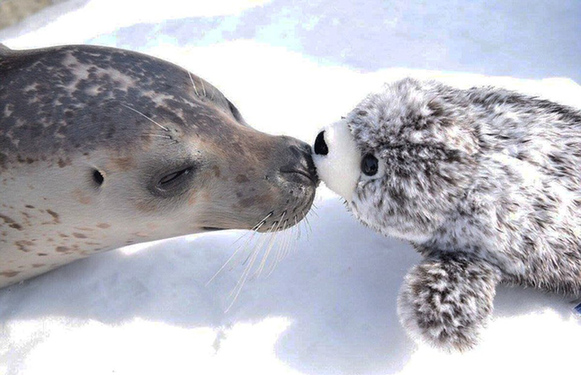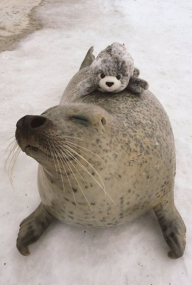 看来日和是把这只玩具当成自己的宝宝了,它让玩具骑在自己的背上,驮着它到处走,甚至还会和它碰鼻子,实在是亲密无间。这样的毛绒玩具,纹别海洋公园的海豹人手一只,一时间成了当地的爆款。