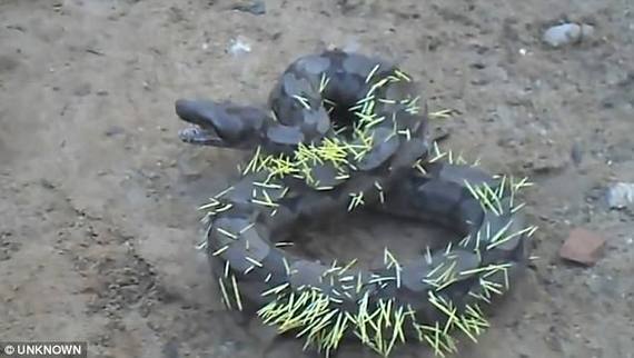 巴西,一条蛇攻击了一头豪猪后,全身被扎满倒刺。