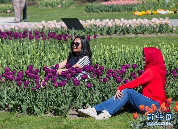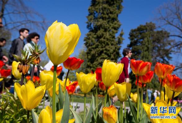 4月9日,游客在瑞士莫尔日郁金香节上赏花。今年的郁金香节共展出约300个品种12万株郁金香。每年4月,瑞士的莫尔日都在莱蒙湖边举行为期6周的郁金香节,吸引大量游客前来参观。1971年,瑞士沃州花卉协会首次在莫尔日举办郁金香节,受到民众热烈欢迎。从那时起,莫尔日每年都举办郁金香节。新华社记者徐金泉摄