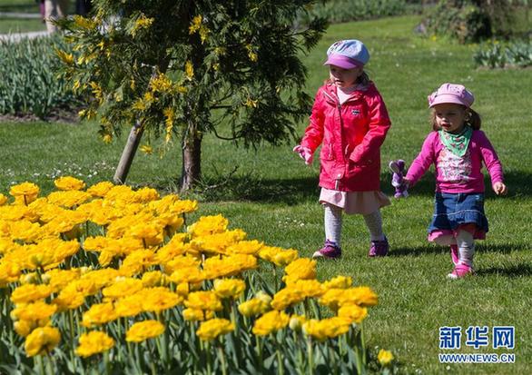 4月9日,两名儿童参观瑞士莫尔日郁金香节。今年的郁金香节共展出约300个品种12万株郁金香。每年4月,瑞士的莫尔日都在莱蒙湖边举行为期6周的郁金香节,吸引大量游客前来参观。1971年,瑞士沃州花卉协会首次在莫尔日举办郁金香节,受到民众热烈欢迎。从那时起,莫尔日每年都举办郁金香节。新华社记者徐金泉摄