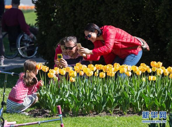4月9日,游客在瑞士莫尔日郁金香节上与花合影。今年的郁金香节共展出约300个品种12万株郁金香。每年4月,瑞士的莫尔日都在莱蒙湖边举行为期6周的郁金香节,吸引大量游客前来参观。1971年,瑞士沃州花卉协会首次在莫尔日举办郁金香节,受到民众热烈欢迎。从那时起,莫尔日每年都举办郁金香节。新华社记者徐金泉摄