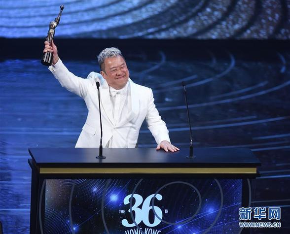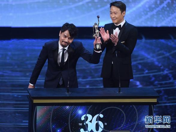 4月9日,第36届香港电影金像奖最佳男主角得主林家栋(左)在颁奖典礼上。当日,第36届香港电影金像奖颁奖典礼在香港文化中心举行。新华社发(王申 摄)