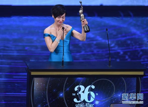 4月9日,第36届香港电影金像奖最佳女配角得主金燕玲在颁奖典礼上。当日,第36届香港电影金像奖颁奖典礼在香港文化中心举行。新华社发(王申 摄)