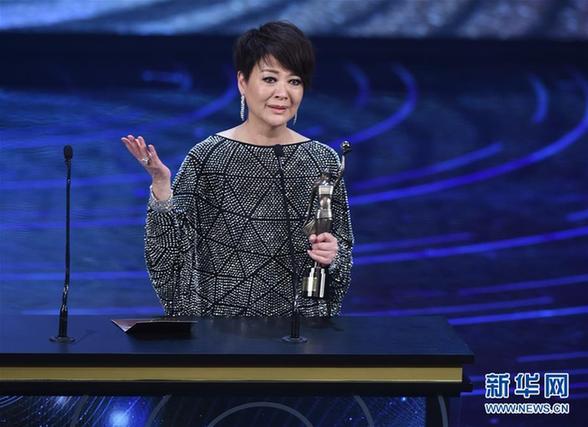 4月9日,第36届香港电影金像奖最佳女主角得主惠英红在颁奖典礼上。当日,第36届香港电影金像奖颁奖典礼在香港文化中心举行。新华社发(王申 摄)