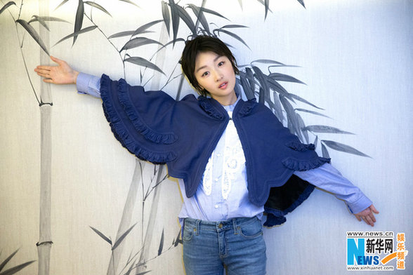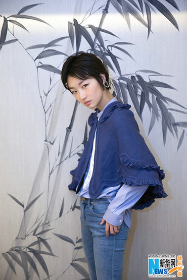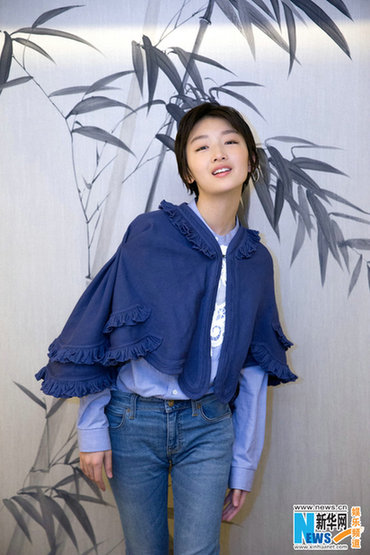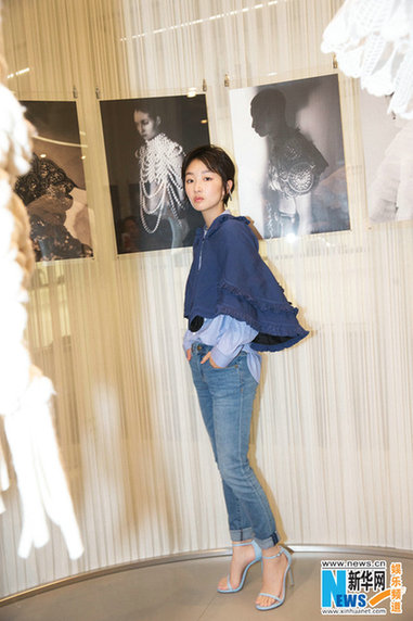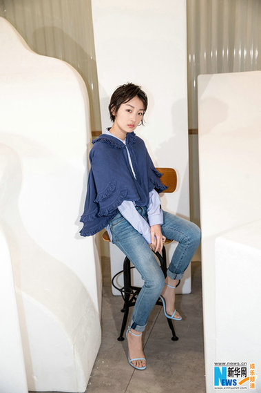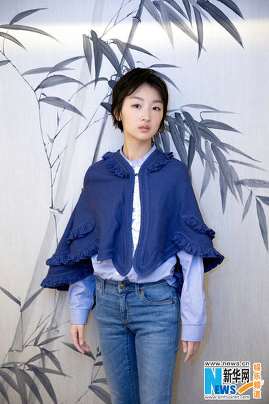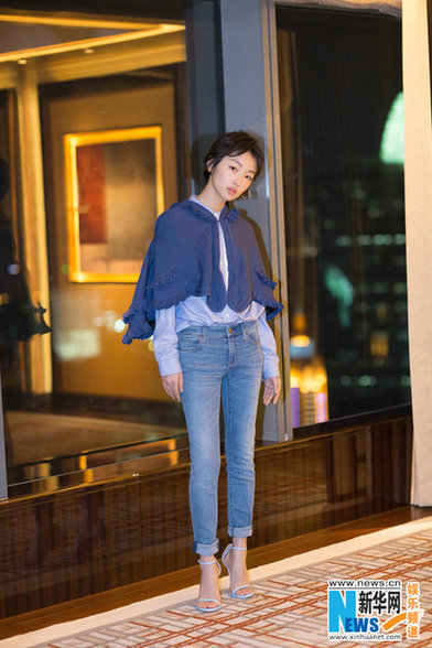 周冬雨身着蓝色披肩搭配贝雷衬衫