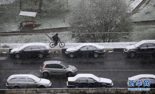 5月11日,在白俄罗斯明斯克,一名男子冒雪骑车。 新华社/路透