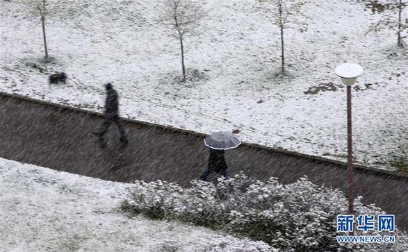 5月11日,在白俄罗斯明斯克,人们走在雪中。 新华社/路透