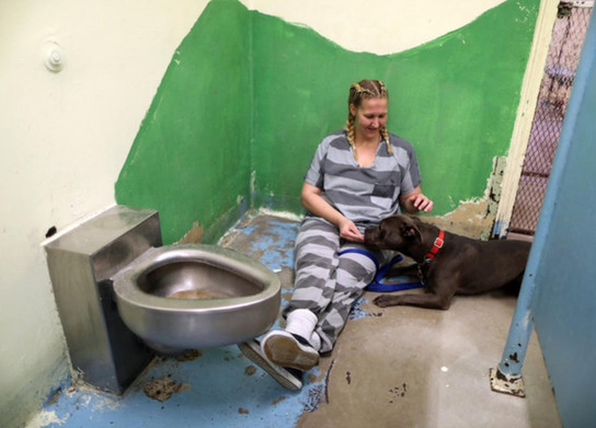 当曾经受到虐待的动物变得更加健康、更加友善时,它们可能会被送到其他监狱跟服刑人员互动。图为Kristina正在喂狗狗吃零食。