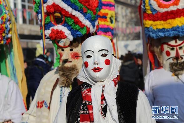 1月27日,在保加利亚佩尔尼克市,人们参加面具巡演。保加利亚佩尔尼克市举办的国际面具节于26日开幕,来自西班牙、意大利、希腊、罗马尼亚等国的近百支面具表演队为观众献上了热闹非凡的面具巡演。新华社记者战小漪 摄