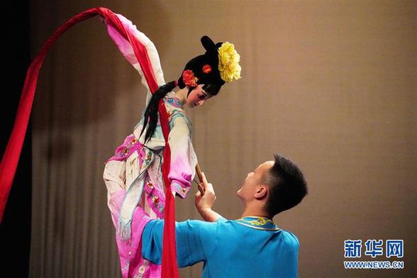 2月5日,在约旦首都安曼,演员在“欢乐春节”演出中表演木偶戏。新华社记者林晓蔚 摄