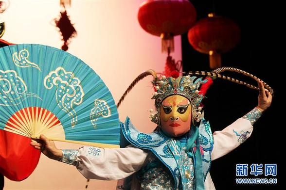 2月5日,在约旦首都安曼,演员在“欢乐春节”演出中表演变脸。新华社发(穆罕默德·阿布·古什 摄)