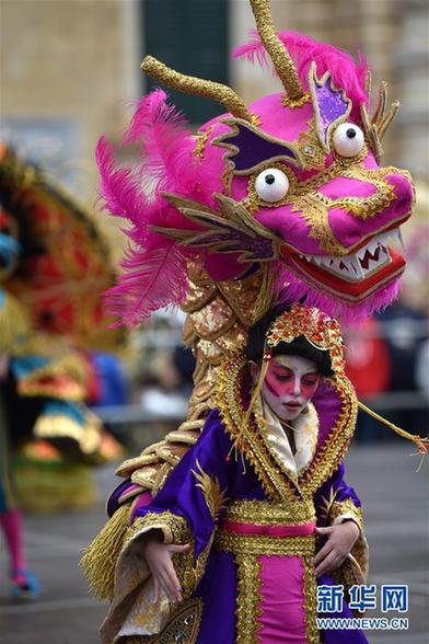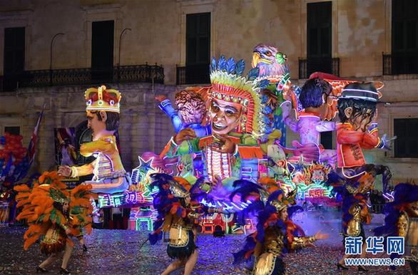这是2月11日在马耳他首都瓦莱塔拍摄的狂欢节巡游花车。本届马耳他狂欢节将持续至2月13日。新华社发(马克·扎米特·科迪纳摄)