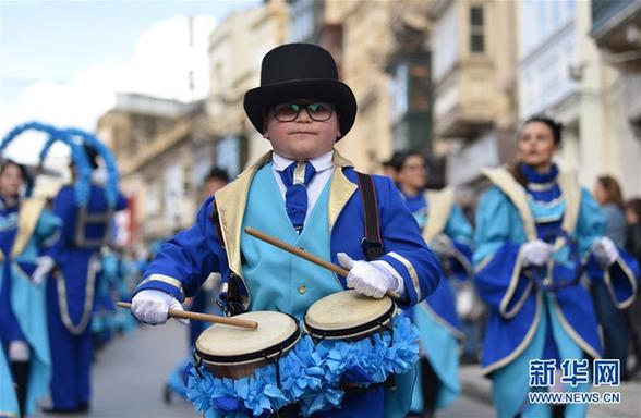 2月11日,在马耳他首都瓦莱塔,一名男孩在狂欢节巡游队伍中打鼓。本届马耳他狂欢节将持续至2月13日。新华社发(马克·扎米特·科迪纳摄)