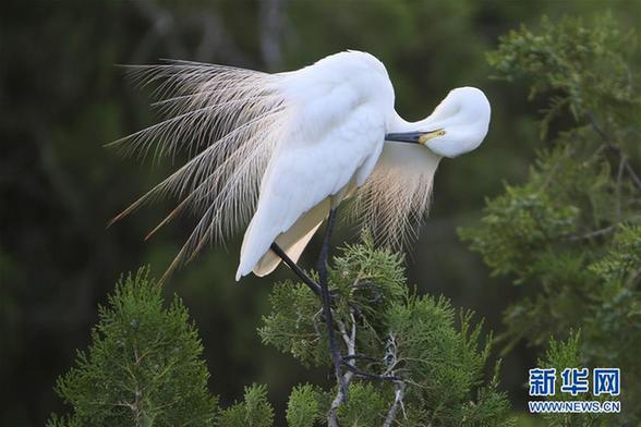 4月9日,一只白鹭在江苏省淮安市盱眙县戚大山森林公园梳理羽毛。 新华社发(周海军 摄)