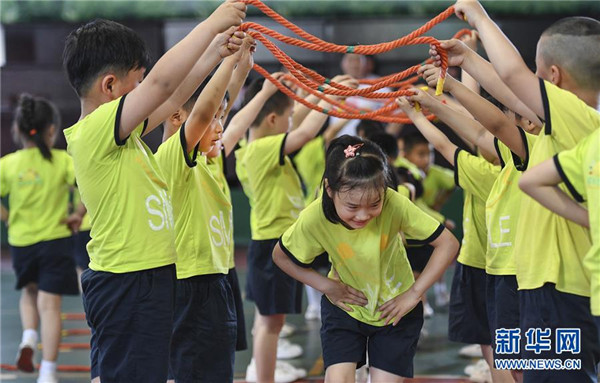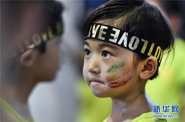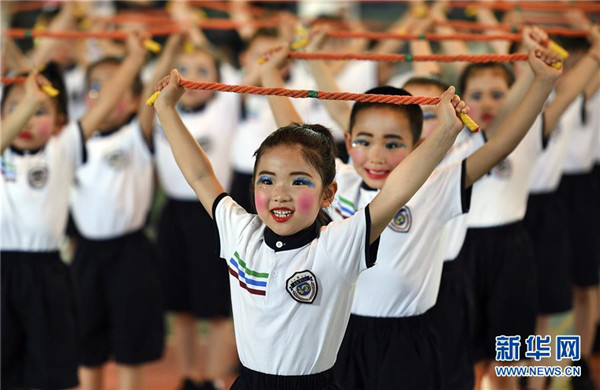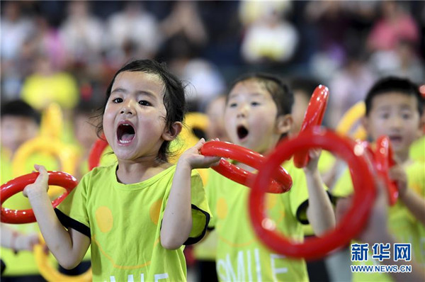 5月16日,一名小朋友在早操表演比赛中。 新华社记者陶明摄