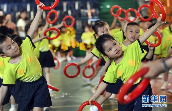 5月16日,舒城县城关幼儿园中一班的小朋友们在进行早操《幸福拍手歌》表演。 新华社记者陶明摄