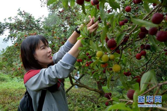 6月3日,一名游客在杨梅节上采摘杨梅。当日,贵州省黔东南苗族侗族自治州榕江县高文苗寨举办杨梅节,吸引众多游客参加“杨梅大王”评选、吃杨梅比赛、吹芦笙、跳芦笙舞等趣味活动。新华社发(刘进银 摄)