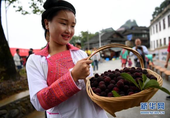 6月3日,一名苗族姑娘在杨梅节上展示杨梅。当日,贵州省黔东南苗族侗族自治州榕江县高文苗寨举办杨梅节,吸引众多游客参加“杨梅大王”评选、吃杨梅比赛、吹芦笙、跳芦笙舞等趣味活动。新华社发(王炳真 摄)