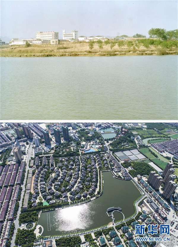 “红木第一村”的小康之路拼版照片:上图为花园村吉祥湖20世纪初原貌(资料照片);下图为2018年6月27日无人机拍摄的花园村吉祥湖及其周边景色(新华社记者徐昱摄)。地处浙江中部的东阳市花园村曾经是一个“村名花园不长花、草棚泥房穷人家”的穷山村。秉持着“以工富农、以商兴村”的发展理念,花园村积极发展传统产业,培育新兴产业,经过不断发展,如今已成为国内最大的红木家具专业市场,被誉为“红木第一村”。近年来,花园村实施大规模旧村改造,兴建了一批旅游景点和特色商业街道,以村为单位创建了国家AAAA级旅游景区。花园村先后被授予“全国模范村”“全国文明村”“中国十大名村”“中国十佳小康村”“中国旅游特色村”“中国幸福村”等诸多荣誉,是老百姓安居乐业的美丽乡村。2016年,花园村党委被中共中央授予“全国先进基层党组织”荣誉称号。2017年,花园村实现营业收入520.63亿元,村民人均年收入达12万元,被誉为浙江农村现代化的典范。新华社发