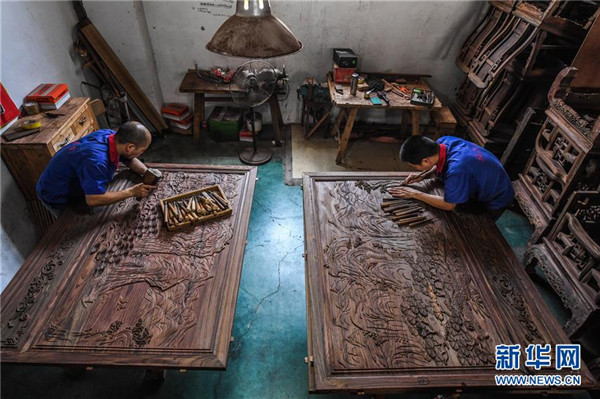 浙江红天下家具有限公司雕花车间的工人在雕刻家具部件(6月27日摄)。地处浙江中部的东阳市花园村曾经是一个“村名花园不长花、草棚泥房穷人家”的穷山村。秉持着“以工富农、以商兴村”的发展理念,花园村积极发展传统产业,培育新兴产业,经过不断发展,如今已成为国内最大的红木家具专业市场,被誉为“红木第一村”。近年来,花园村实施大规模旧村改造,兴建了一批旅游景点和特色商业街道,以村为单位创建了国家AAAA级旅游景区。花园村先后被授予“全国模范村”“全国文明村”“中国十大名村”“中国十佳小康村”“中国旅游特色村”“中国幸福村”等诸多荣誉,是老百姓安居乐业的美丽乡村。2016年,花园村党委被中共中央授予“全国先进基层党组织”荣誉称号。2017年,花园村实现营业收入520.63亿元,村民人均年收入达12万元,被誉为浙江农村现代化的典范。新华社记者 徐昱 摄