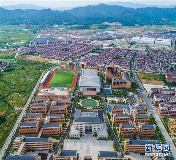 这是浙江师范大学附属东阳花园外国语学校(6月28日无人机拍摄)。这所学校是覆盖从学前教育到高中教育的15年一贯制国际化学校。地处浙江中部的东阳市花园村曾经是一个“村名花园不长花、草棚泥房穷人家”的穷山村。秉持着“以工富农、以商兴村”的发展理念,花园村积极发展传统产业,培育新兴产业,经过不断发展,如今已成为国内最大的红木家具专业市场,被誉为“红木第一村”。近年来,花园村实施大规模旧村改造,兴建了一批旅游景点和特色商业街道,以村为单位创建了国家AAAA级旅游景区。花园村先后被授予“全国模范村”“全国文明村”“中国十大名村”“中国十佳小康村”“中国旅游特色村”“中国幸福村”等诸多荣誉,是老百姓安居乐业的美丽乡村。2016年,花园村党委被中共中央授予“全国先进基层党组织”荣誉称号。2017年,花园村实现营业收入520.63亿元,村民人均年收入达12万元,被誉为浙江农村现代化的典范。新华社记者 徐昱 摄