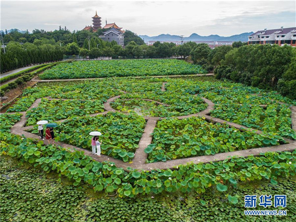 游客在浙江东阳花园村的生态农业园内赏荷(6月28日无人机拍摄)。地处浙江中部的东阳市花园村曾经是一个“村名花园不长花、草棚泥房穷人家”的穷山村。秉持着“以工富农、以商兴村”的发展理念,花园村积极发展传统产业,培育新兴产业,经过不断发展,如今已成为国内最大的红木家具专业市场,被誉为“红木第一村”。近年来,花园村实施大规模旧村改造,兴建了一批旅游景点和特色商业街道,以村为单位创建了国家AAAA级旅游景区。花园村先后被授予“全国模范村”“全国文明村”“中国十大名村”“中国十佳小康村”“中国旅游特色村”“中国幸福村”等诸多荣誉,是老百姓安居乐业的美丽乡村。2016年,花园村党委被中共中央授予“全国先进基层党组织”荣誉称号。2017年,花园村实现营业收入520.63亿元,村民人均年收入达12万元,被誉为浙江农村现代化的典范。新华社记者 徐昱 摄