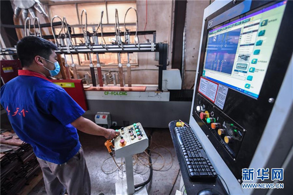 浙江红天下家具有限公司工人在车间操作机器对木材进行精细加工(6月27日摄)。地处浙江中部的东阳市花园村曾经是一个“村名花园不长花、草棚泥房穷人家”的穷山村。秉持着“以工富农、以商兴村”的发展理念,花园村积极发展传统产业,培育新兴产业,经过不断发展,如今已成为国内最大的红木家具专业市场,被誉为“红木第一村”。近年来,花园村实施大规模旧村改造,兴建了一批旅游景点和特色商业街道,以村为单位创建了国家AAAA级旅游景区。花园村先后被授予“全国模范村”“全国文明村”“中国十大名村”“中国十佳小康村”“中国旅游特色村”“中国幸福村”等诸多荣誉,是老百姓安居乐业的美丽乡村。2016年,花园村党委被中共中央授予“全国先进基层党组织”荣誉称号。2017年,花园村实现营业收入520.63亿元,村民人均年收入达12万元,被誉为浙江农村现代化的典范。新华社记者 徐昱 摄
