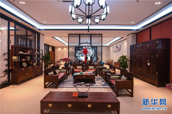 东阳花园村的花园红木家具城的一处家具展示空间(6月28日摄)。该红木家具城是国内最大的红木产业市场之一,总面积约40万平方米,拥有品牌经营户1800多家。地处浙江中部的东阳市花园村曾经是一个“村名花园不长花、草棚泥房穷人家”的穷山村。秉持着“以工富农、以商兴村”的发展理念,花园村积极发展传统产业,培育新兴产业,经过不断发展,如今已成为国内最大的红木家具专业市场,被誉为“红木第一村”。近年来,花园村实施大规模旧村改造,兴建了一批旅游景点和特色商业街道,以村为单位创建了国家AAAA级旅游景区。花园村先后被授予“全国模范村”“全国文明村”“中国十大名村”“中国十佳小康村”“中国旅游特色村”“中国幸福村”等诸多荣誉,是老百姓安居乐业的美丽乡村。2016年,花园村党委被中共中央授予“全国先进基层党组织”荣誉称号。2017年,花园村实现营业收入520.63亿元,村民人均年收入达12万元,被誉为浙江农村现代化的典范。新华社记者 徐昱 摄