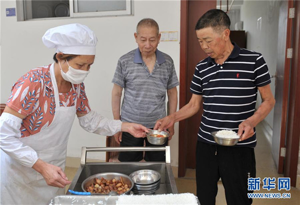 东阳市花园老年公寓的工作人员在为老人送餐(6月28日摄)。花园村于2008年创办老年公寓,对村里的五保户老人以及孤寡老人实行集中供养,目前这里居住着130余位老人。地处浙江中部的东阳市花园村曾经是一个“村名花园不长花、草棚泥房穷人家”的穷山村。秉持着“以工富农、以商兴村”的发展理念,花园村积极发展传统产业,培育新兴产业,经过不断发展,如今已成为国内最大的红木家具专业市场,被誉为“红木第一村”。近年来,花园村实施大规模旧村改造,兴建了一批旅游景点和特色商业街道,以村为单位创建了国家AAAA级旅游景区。花园村先后被授予“全国模范村”“全国文明村”“中国十大名村”“中国十佳小康村”“中国旅游特色村”“中国幸福村”等诸多荣誉,是老百姓安居乐业的美丽乡村。2016年,花园村党委被中共中央授予“全国先进基层党组织”荣誉称号。2017年,花园村实现营业收入520.63亿元,村民人均年收入达12万元,被誉为浙江农村现代化的典范。新华社记者 陈海通 摄