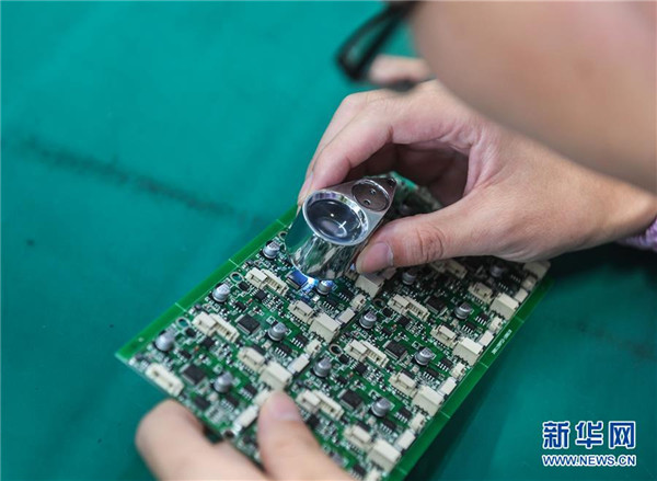 花园金波科技股份有限公司工作人员在车间对刚生产的智能控制芯片产品进行人工抽检(6月28日摄)。该公司是国家高新技术企业,产品覆盖汽车、光伏、家电等行业。地处浙江中部的东阳市花园村曾经是一个“村名花园不长花、草棚泥房穷人家”的穷山村。秉持着“以工富农、以商兴村”的发展理念,花园村积极发展传统产业,培育新兴产业,经过不断发展,如今已成为国内最大的红木家具专业市场,被誉为“红木第一村”。近年来,花园村实施大规模旧村改造,兴建了一批旅游景点和特色商业街道,以村为单位创建了国家AAAA级旅游景区。花园村先后被授予“全国模范村”“全国文明村”“中国十大名村”“中国十佳小康村”“中国旅游特色村”“中国幸福村”等诸多荣誉,是老百姓安居乐业的美丽乡村。2016年,花园村党委被中共中央授予“全国先进基层党组织”荣誉称号。2017年,花园村实现营业收入520.63亿元,村民人均年收入达12万元,被誉为浙江农村现代化的典范。新华社记者 徐昱 摄