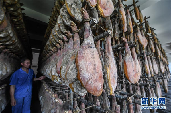 浙江老汤火腿食品有限公司工作人员在火腿发酵车间进行虫害检查(6月28日摄)。该公司坚持采用传统工艺制作金华火腿,是浙江省农业龙头企业。地处浙江中部的东阳市花园村曾经是一个“村名花园不长花、草棚泥房穷人家”的穷山村。秉持着“以工富农、以商兴村”的发展理念,花园村积极发展传统产业,培育新兴产业,经过不断发展,如今已成为国内最大的红木家具专业市场,被誉为“红木第一村”。近年来,花园村实施大规模旧村改造,兴建了一批旅游景点和特色商业街道,以村为单位创建了国家AAAA级旅游景区。花园村先后被授予“全国模范村”“全国文明村”“中国十大名村”“中国十佳小康村”“中国旅游特色村”“中国幸福村”等诸多荣誉,是老百姓安居乐业的美丽乡村。2016年,花园村党委被中共中央授予“全国先进基层党组织”荣誉称号。2017年,花园村实现营业收入520.63亿元,村民人均年收入达12万元,被誉为浙江农村现代化的典范。新华社记者 徐昱 摄