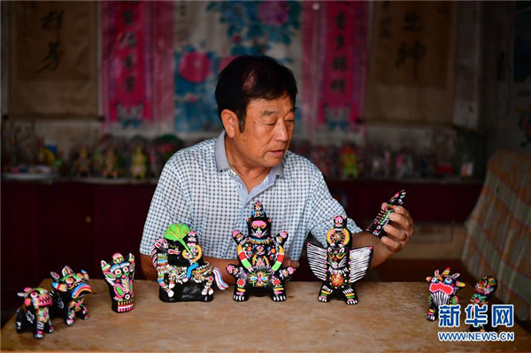 7月9日,在河南淮阳城关镇金庄村,泥泥狗艺人任国和展示造型各异的泥泥狗。 新华社记者 冯大鹏 摄