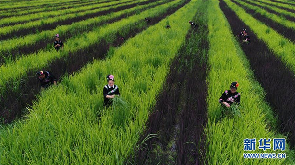 7月24日,阳芳村村民在“五彩稻谷”田间劳作。 时值盛夏,贵州台江县台盘乡阳芳村处于生长期的“五彩稻谷”长势喜人。这种稻谷成熟后米粒将呈现黑、紫、粉红、紫红、白五种颜色。 在当地驻村干部和浙江大学农学院教授的帮助下,阳芳村自2016年开始试种非杂交的生态五彩稻谷。2017年,该村种植的80余亩“五彩稻谷”收成后被订购一空,每亩“五彩稻谷”创收5800余元,总收益近50万元。 今年,尝到甜头的村民积极参与“五彩稻谷”种植,将种植面积扩大到100余亩。 新华社记者 杨楹 摄