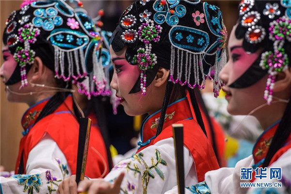 在合肥市凿壁偷光图书城,孩子们在表演戏曲节目(9月4日摄)。9月4日,安徽省合肥经开区第二届“戏曲进校园”比赛暨学校少年宫戏曲社团展演在该市凿壁偷光图书城举行,14所中小学的近200名学生登台献艺。新华社记者 郭晨 摄