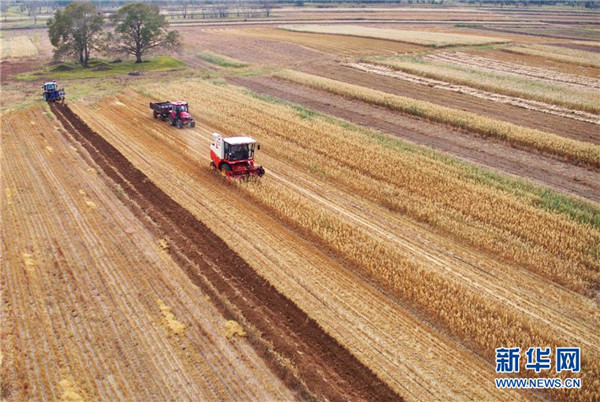 10月4日,河北省张家口市尚义县南壕堑镇台路村的农民在使用机械设备收割莜麦(无人机拍摄)。