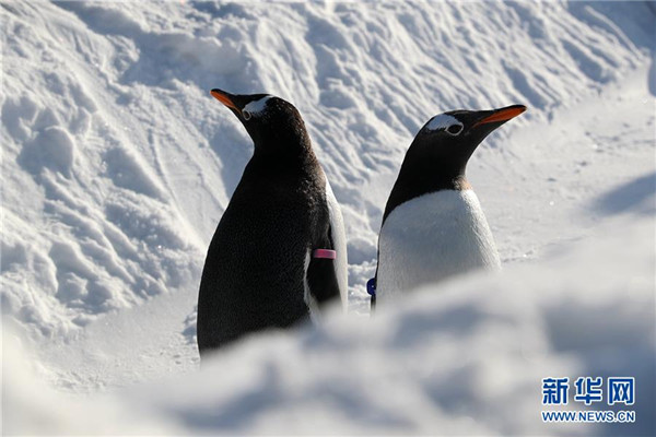 12月24日,哈尔滨极地馆的两只企鹅在室外活动。