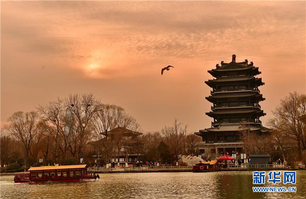 海鸥在夕阳下的大明湖上飞翔(2月7日摄)。