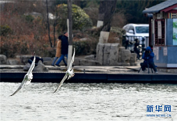 摄影爱好者在大明湖畔拍摄海鸥(2月7日摄)。 新华社记者 张汝锋 摄