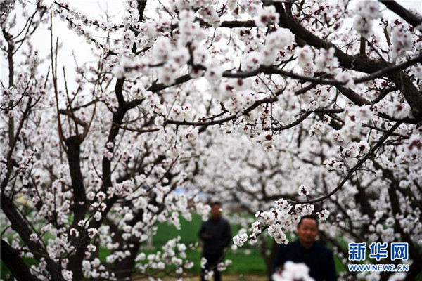 3月21日,佃户屯街道办事处的居民在观赏杏花。春分时节,山东省菏泽市佃户屯街道办事处的麦田绿意盎然,农田中的杏树也已开出杏花,一派春回大地的景象。 新华社记者 王凯 摄