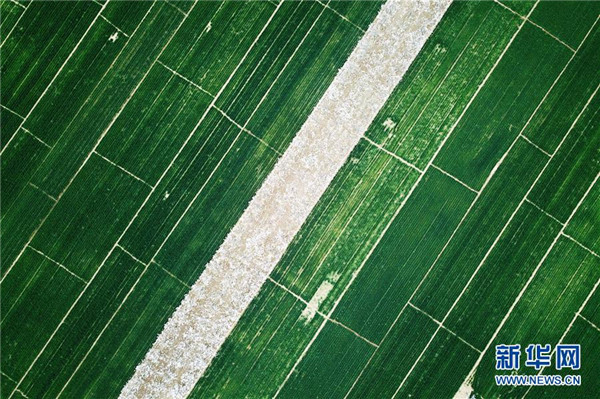 这是3月21日无人机拍摄的麦田和麦田中的杏树带。春分时节,山东省菏泽市佃户屯街道办事处的麦田绿意盎然,农田中的杏树也已开出杏花,一派春回大地的景象。 新华社记者 王南 摄