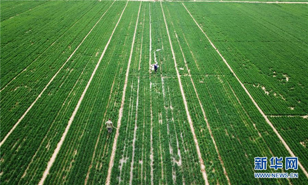 佃户屯街道办事处的农民在麦田里进行春管作业(3月21日无人机拍摄)。春分时节,山东省菏泽市佃户屯街道办事处的麦田绿意盎然,农田中的杏树也已开出杏花,一派春回大地的景象。 新华社记者 王南 摄