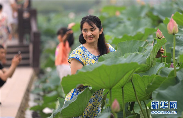 7月22日,一名游客在前关湿地公园里留影。新华社记者 姚剑锋 摄