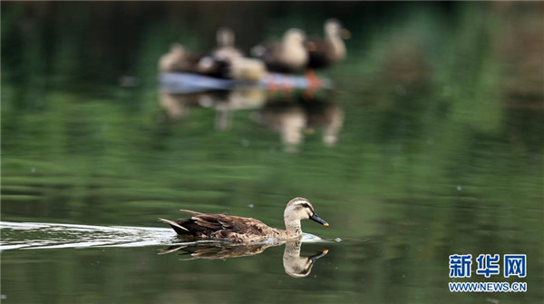 7月22日,一只野鸭浮游在前关湿地公园里。新华社记者 姚剑锋 摄
