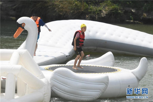 7月25日,小朋友在合村乡后溪村“竹溪乐园”水上游乐项目里戏水。近年来,浙江省桐庐县合村乡着力打造以“运动探险”为主打的乡村旅游品牌,重点建设田园风情带、民俗文化带、民宿集聚带和运动休闲带“四条精品带”,提升全域景区一体化、多样化、个性化,助力乡村振兴。 新华社记者 黄宗治 摄