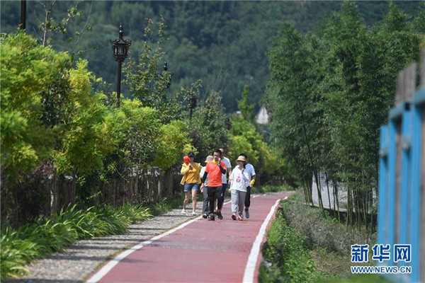 7月25日,游客在合村乡后溪村的溪边绿道上观光。近年来,浙江省桐庐县合村乡着力打造以“运动探险”为主打的乡村旅游品牌,重点建设田园风情带、民俗文化带、民宿集聚带和运动休闲带“四条精品带”,提升全域景区一体化、多样化、个性化,助力乡村振兴。 新华社记者 黄宗治 摄