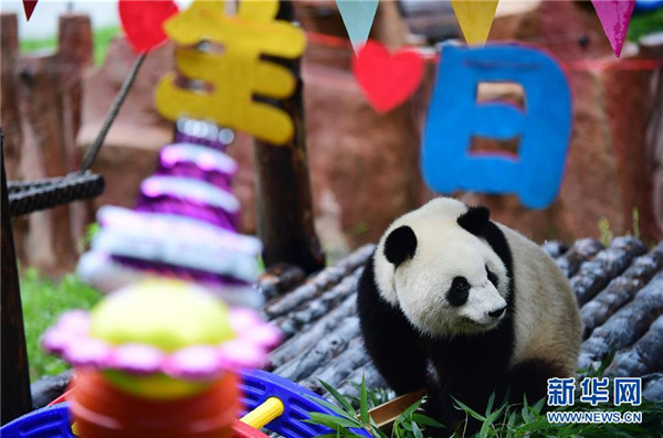 这是7月30日在长春市东北虎园熊猫馆拍摄的大熊猫“初心”。新华社记者 林宏 摄