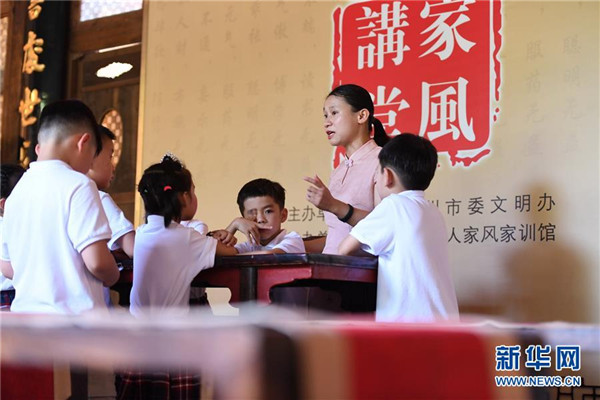 7月30日,福州金山小学老师陈珊在福州三坊七巷名人家风家训馆为孩子们讲名人故事。当日,福州金山小学的几名学生在老师的带领下到福州三坊七巷、鳌峰坊等处感受闽都文化,丰富暑期生活。 新华社记者 林善传 摄