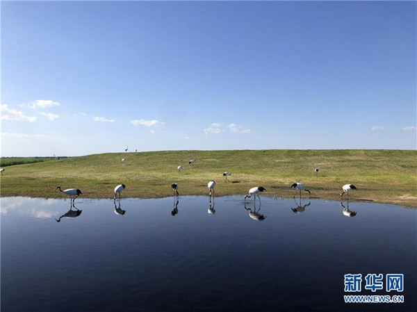 在黑龙江扎龙国家级自然保护区,丹顶鹤在水中觅食(6月18日摄)。曾经,黑龙江扎龙国家级自然保护区面临湿地退化、“人鸟争食”的威胁。近年来,生态文明理念在这里落地生根。通过采取长效补水机制、生态移民搬迁等方式,丹顶鹤野生种群不断壮大。湿地生态保护的“扎龙探索”,增强了人们对人与自然和谐共生的美好期待。 新华社记者王建摄