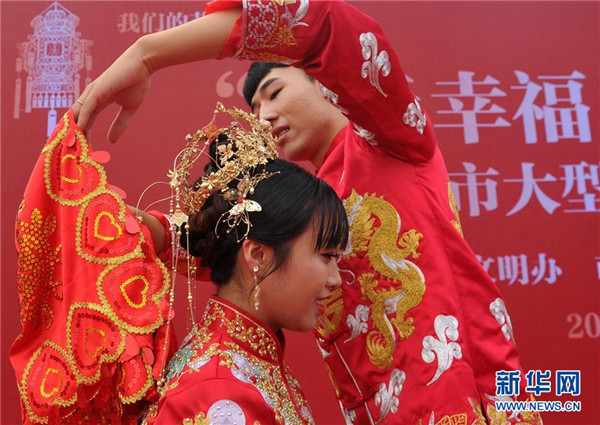 8月6日,在河北黄骅南海公园举办的“执手幸福·为爱减负”大型公益集体婚礼上,新人行揭盖头礼。 新华社记者 朱旭东 摄