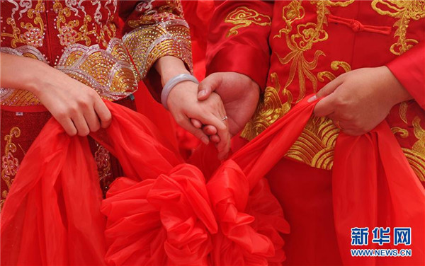 8月6日,在河北黄骅南海公园举办的“执手幸福·为爱减负”大型公益集体婚礼上,一对新人手持红绣球牵手。 新华社记者 朱旭东 摄
